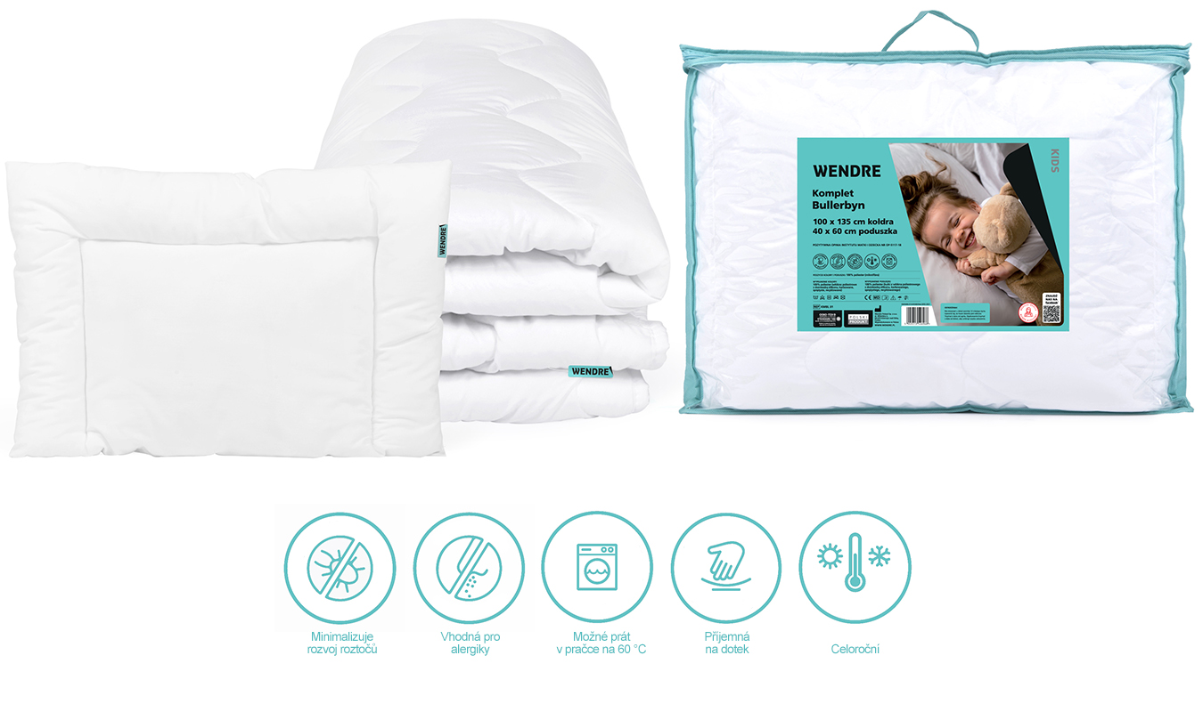 Súprava BULLERBYN sa skladá z prikrývky s rozmermi 100 × 135 cm a vankúša s rozmermi 40 × 60 cm. Tento kvalitný antialergický výrobok je zapísaný v registri zdravotníckych pomôcok a spĺňa najvyššie bezpečnostné a hygienické normy. Odporúčajú ho aj zdravotnícke zariadenia, pretože poskytuje zdravé a pohodlné prostredie na spanie pre deti a dospelých s citlivou pokožkou.